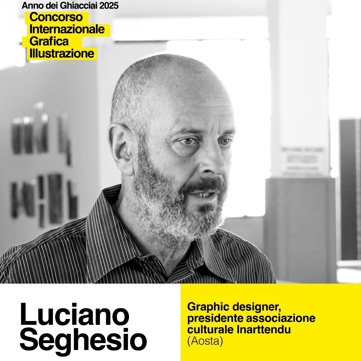 Luciano Seghesio – Gallery owner, renowned graphic designer, and president of the Inarttendu Cultural Association of Aosta. Through his curatorial and artistic work, he has supported numerous artists and innovative projects, contributing to the promotion of contemporary graphic design.